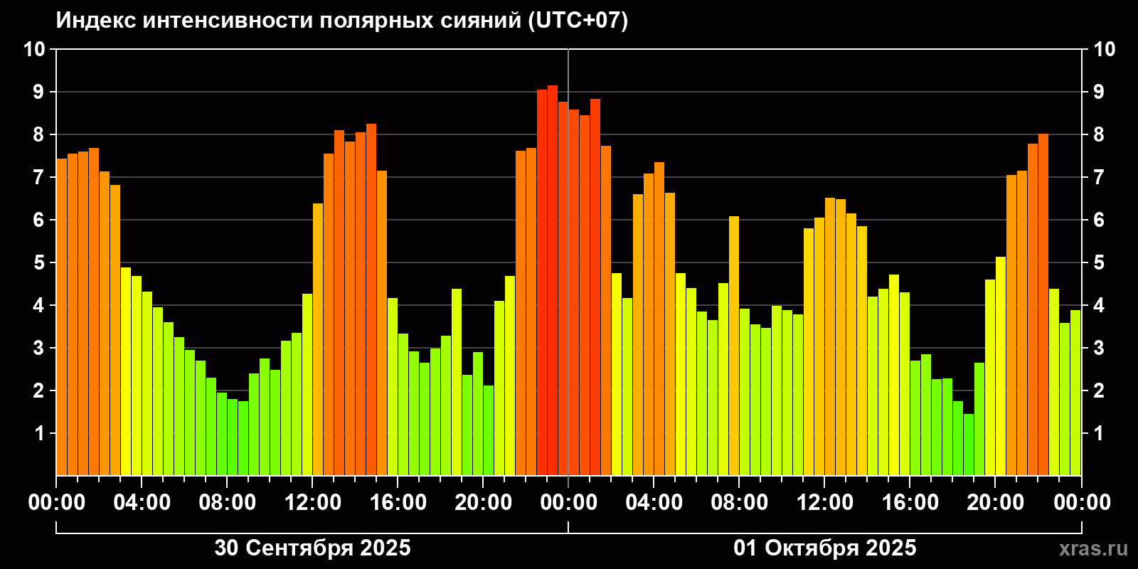 Изменения индекса интенсивности полярных сияний с 2025-09-30 по 2025-10-01 по местному времени