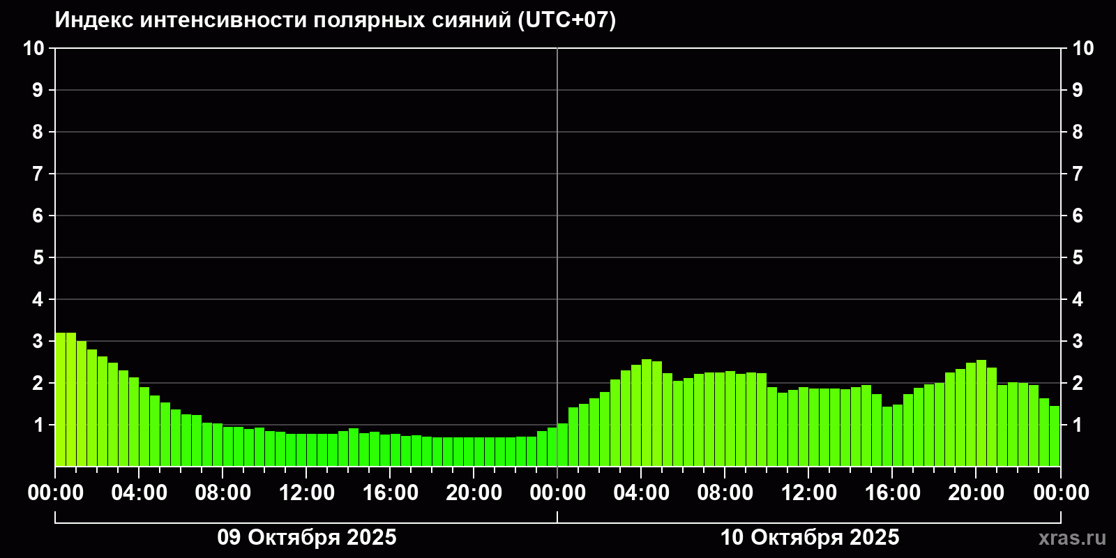 Изменения индекса интенсивности полярных сияний с 2025-10-09 по 2025-10-10 по местному времени