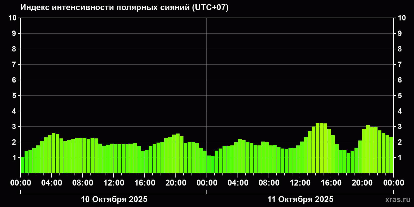 Изменения индекса интенсивности полярных сияний с 2025-10-10 по 2025-10-11 по местному времени