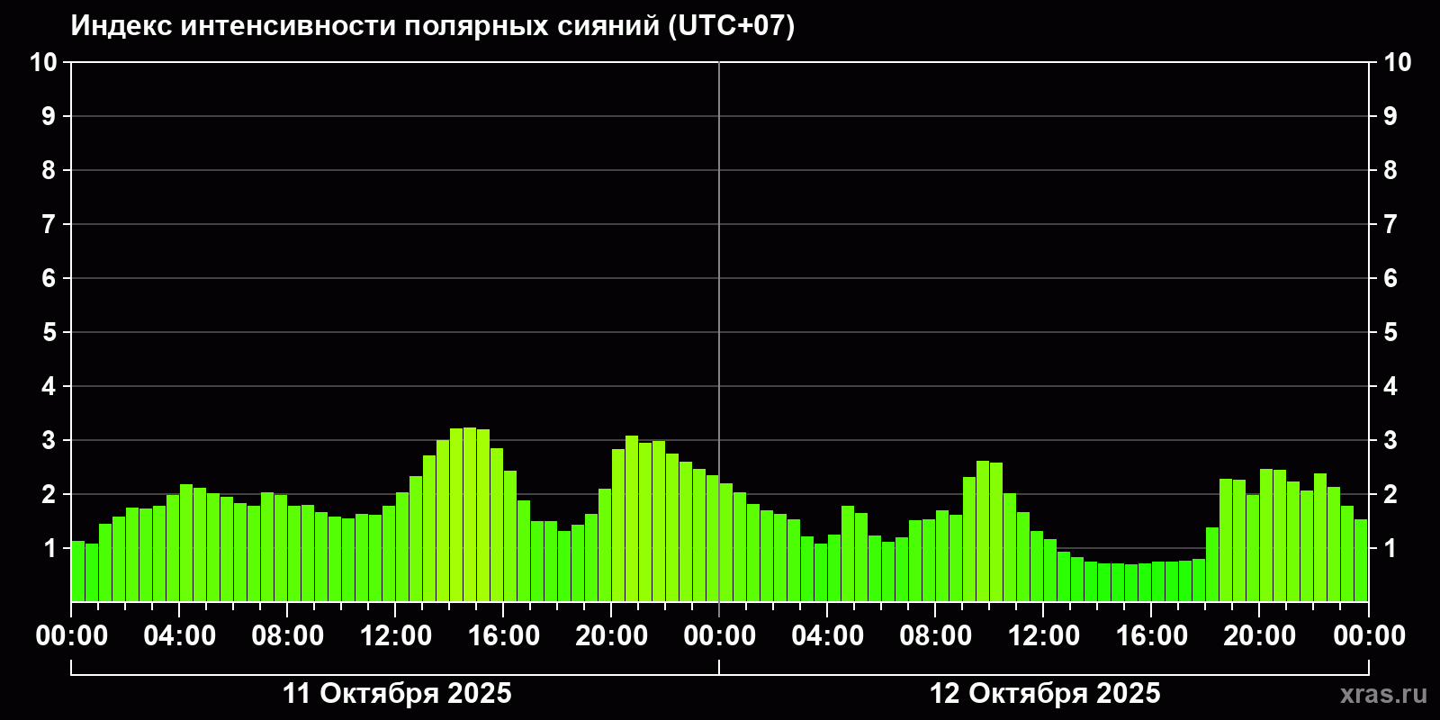Изменения индекса интенсивности полярных сияний с 2025-10-11 по 2025-10-12 по местному времени