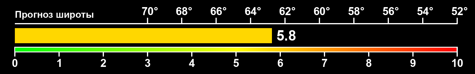 Индекс интенсивности полярных сияний и теоретически возможная широта наблюдений для ночного времени в восточном полушарии по состоянию на 2025-11-25 23:51 (конец дня) по местному времени