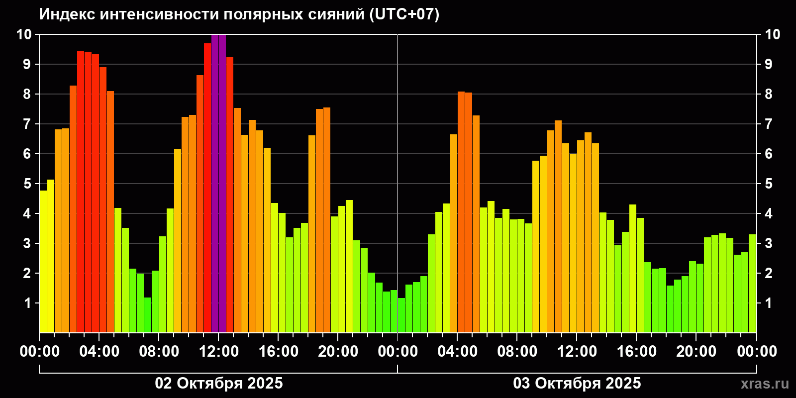 Изменения индекса интенсивности полярных сияний с 2025-10-02 по 2025-10-03 по местному времени