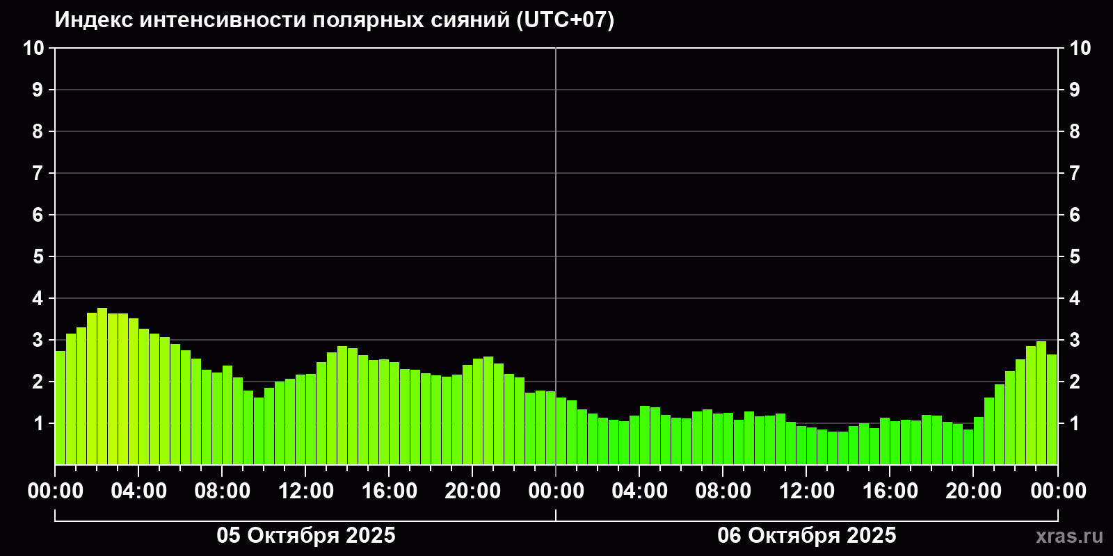 Изменения индекса интенсивности полярных сияний с 2025-10-05 по 2025-10-06 по местному времени