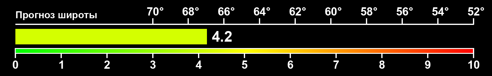 Индекс интенсивности полярных сияний и теоретически возможная широта наблюдений для ночного времени в восточном полушарии по состоянию на 2025-10-07 23:49 (конец дня) по местному времени