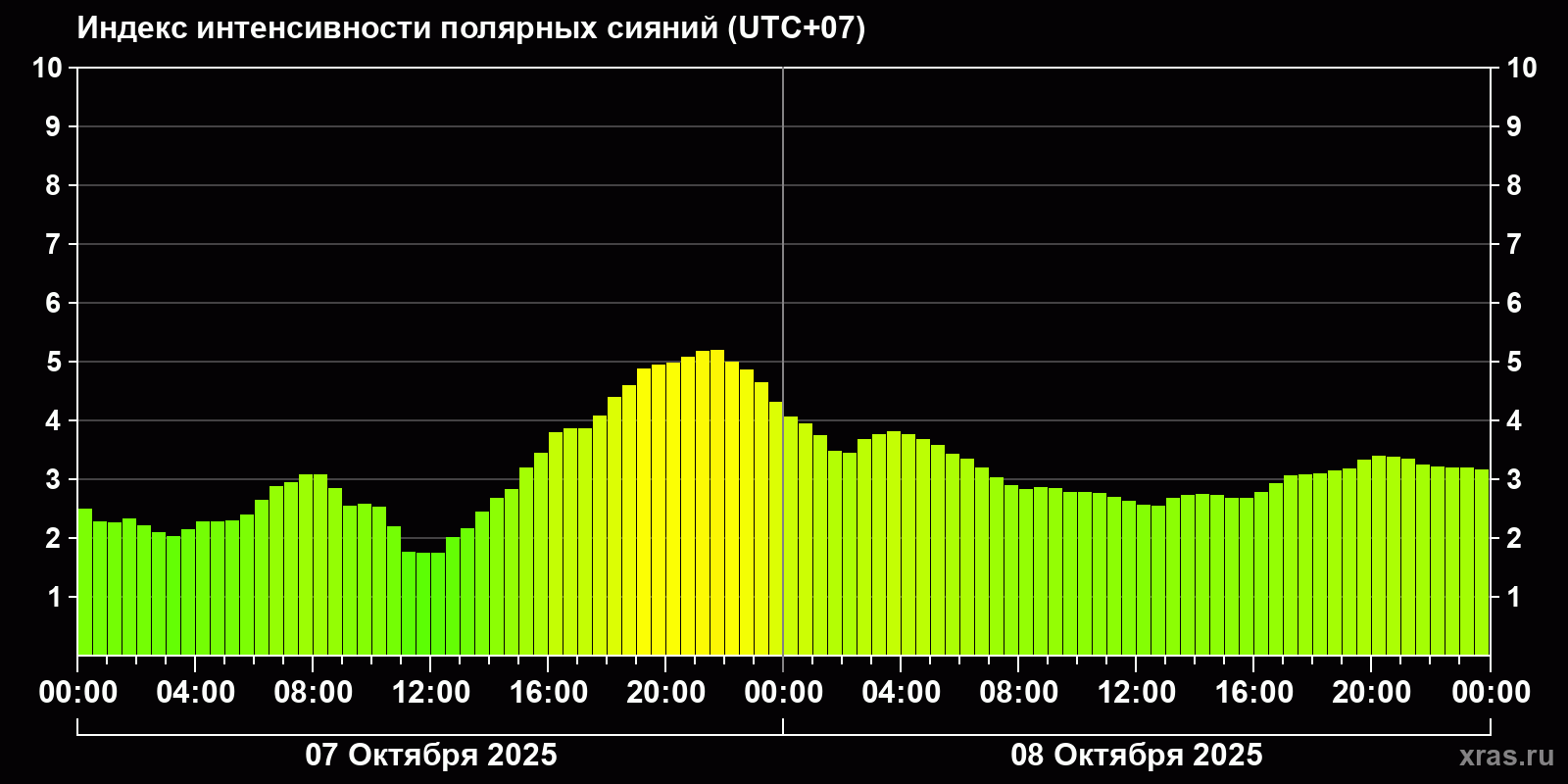 Изменения индекса интенсивности полярных сияний с 2025-10-07 по 2025-10-08 по местному времени