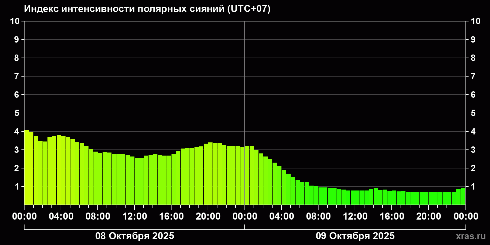 Изменения индекса интенсивности полярных сияний с 2025-10-08 по 2025-10-09 по местному времени