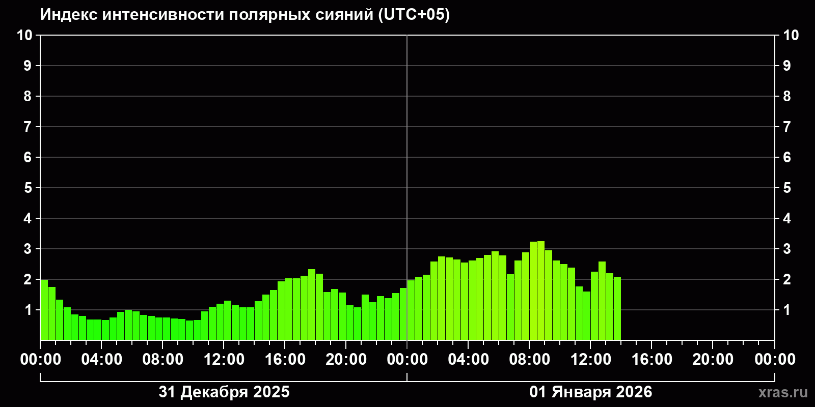 Изменения индекса интенсивности полярных сияний с 2025-12-31 по 2026-01-01 по местному времени