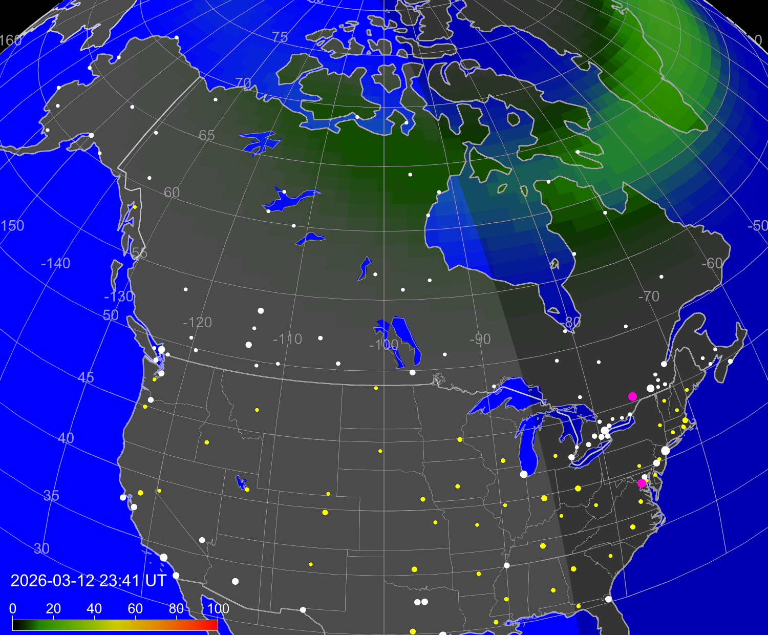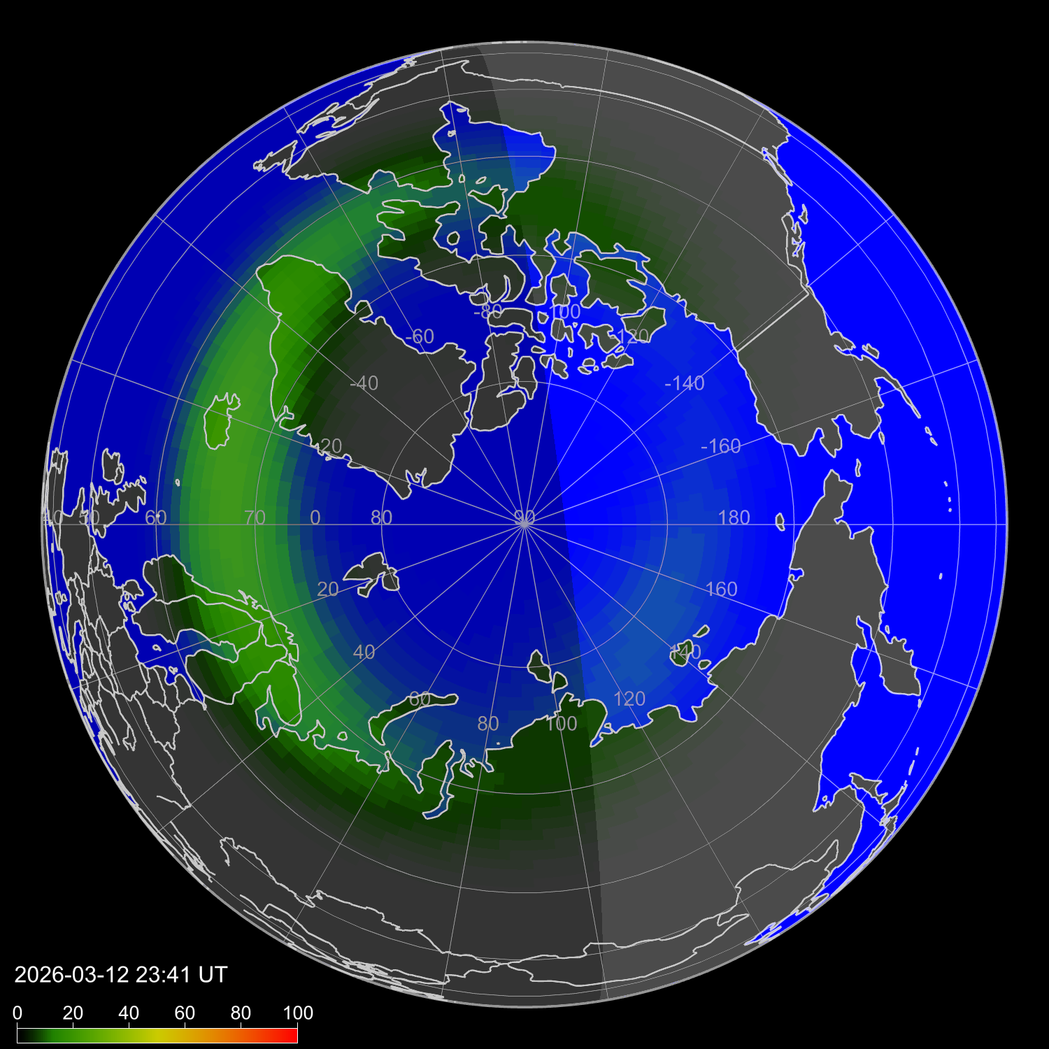 Индекс интенсивности полярных сияний и теоретически возможная широта наблюдений для ночного времени в западном полушарии