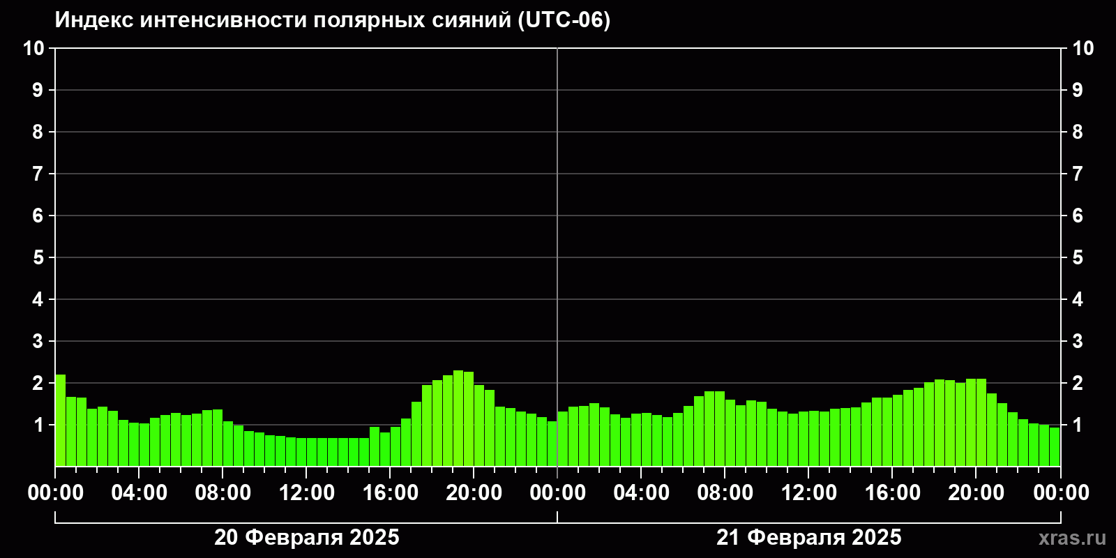 Изменения индекса интенсивности полярных сияний с 2025-02-20 по 2025-02-21 по местному времени