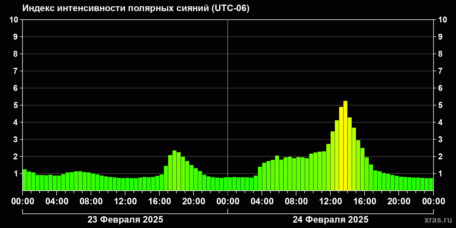 Изменения индекса интенсивности полярных сияний с 2025-02-23 по 2025-02-24 по местному времени