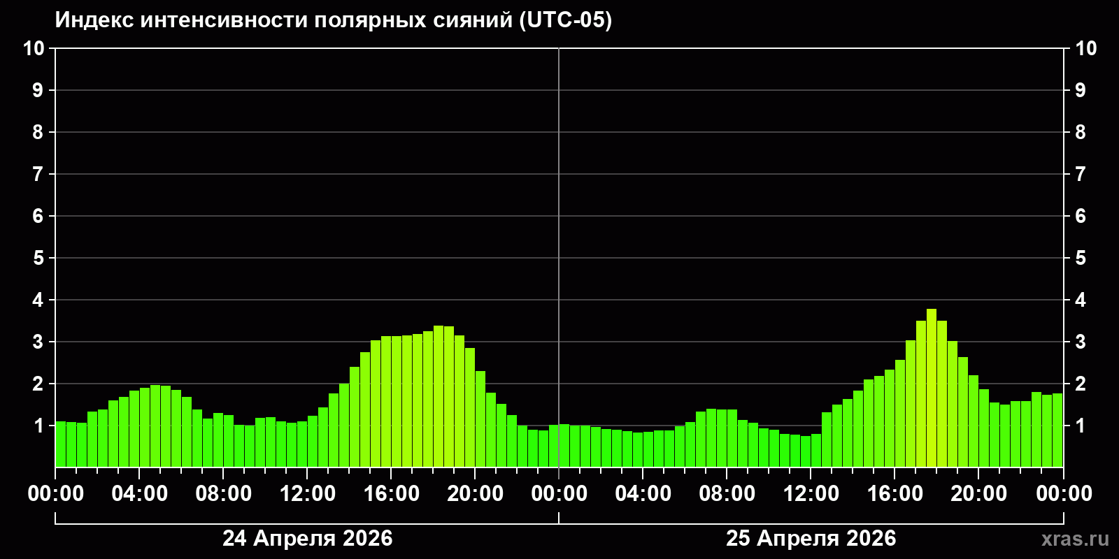 Изменения индекса интенсивности полярных сияний с 2026-04-24 по 2026-04-25 по местному времени