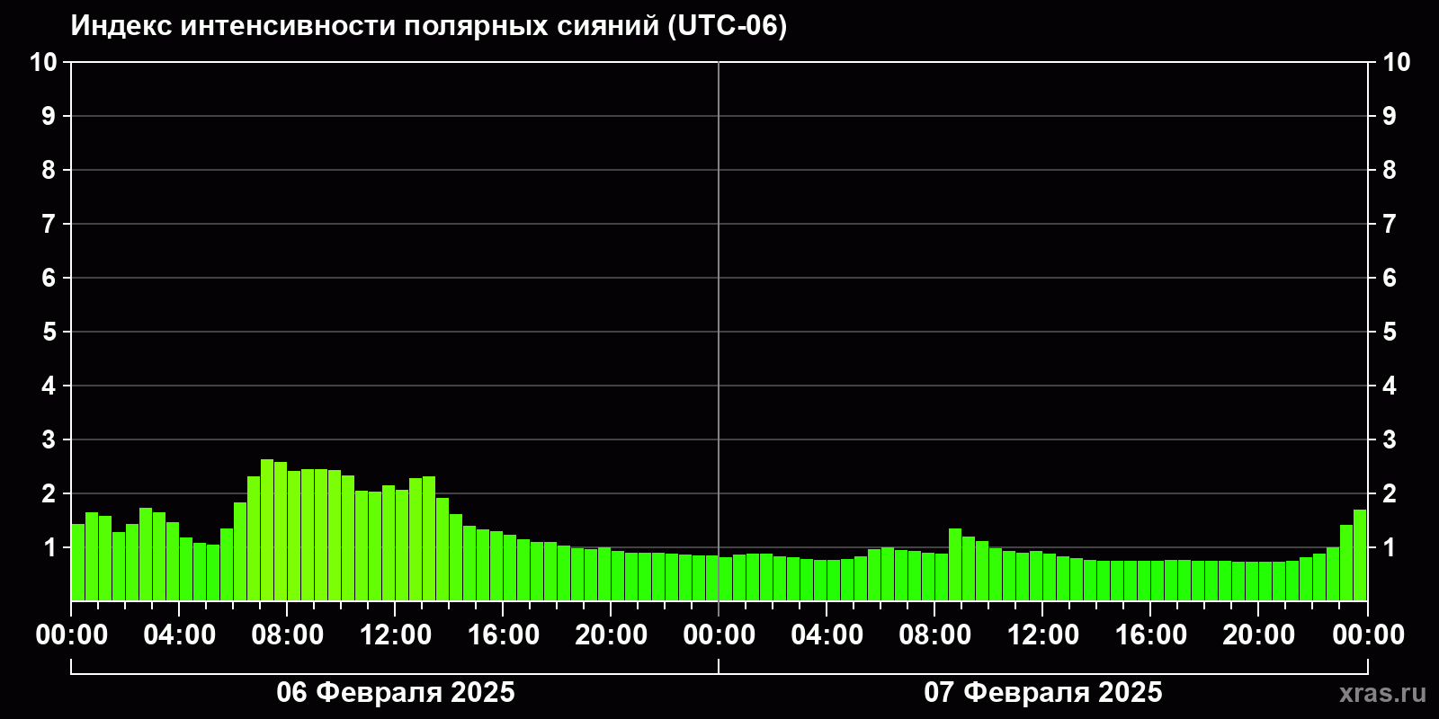 Изменения индекса интенсивности полярных сияний с 2025-02-06 по 2025-02-07 по местному времени