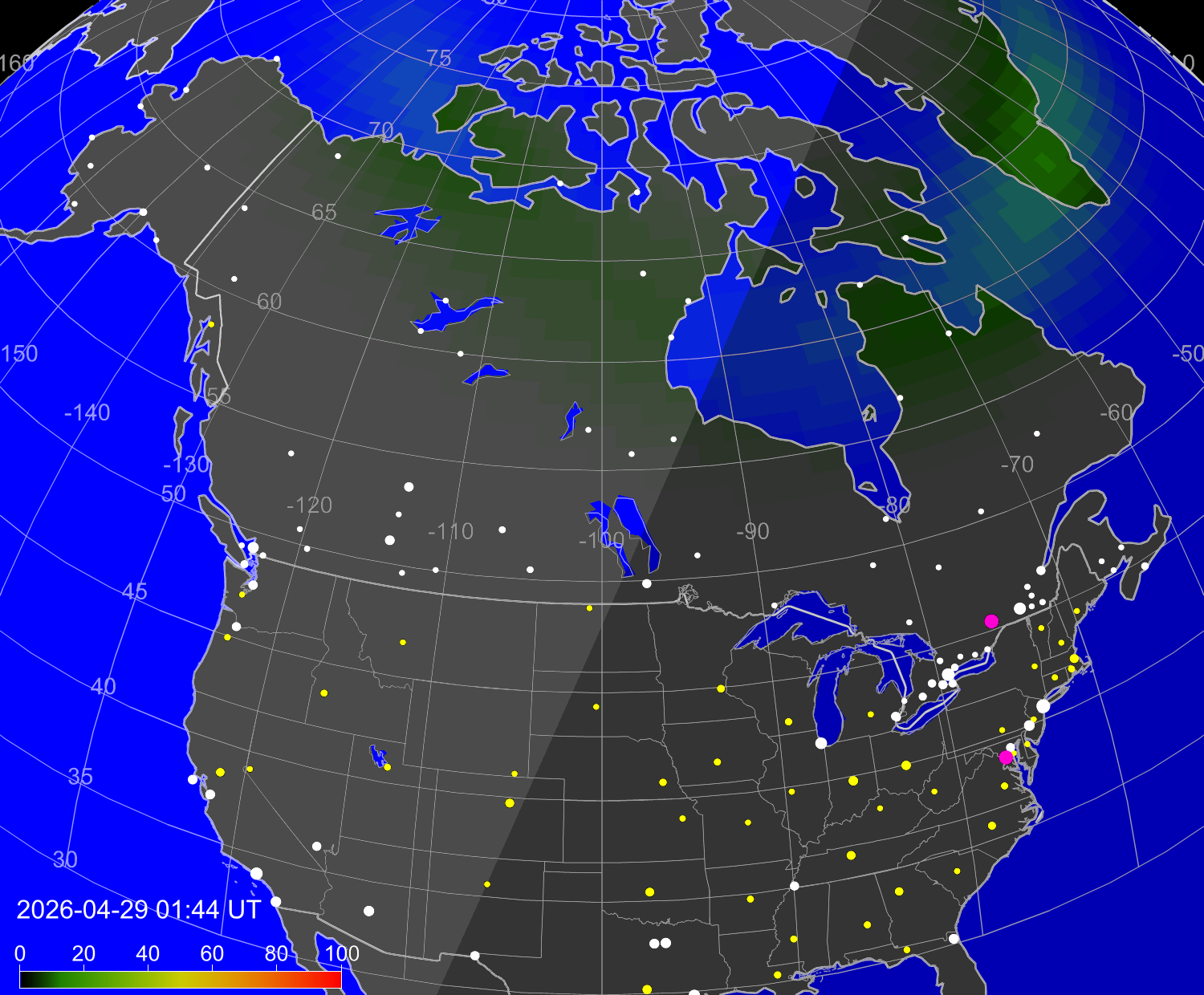Индекс интенсивности полярных сияний и теоретически возможная широта наблюдений для ночного времени в западном полушарии