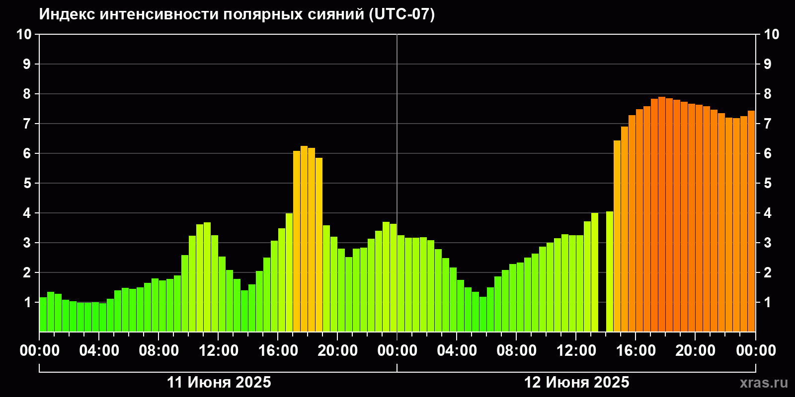 Изменения индекса интенсивности полярных сияний с 2025-06-11 по 2025-06-12 по местному времени