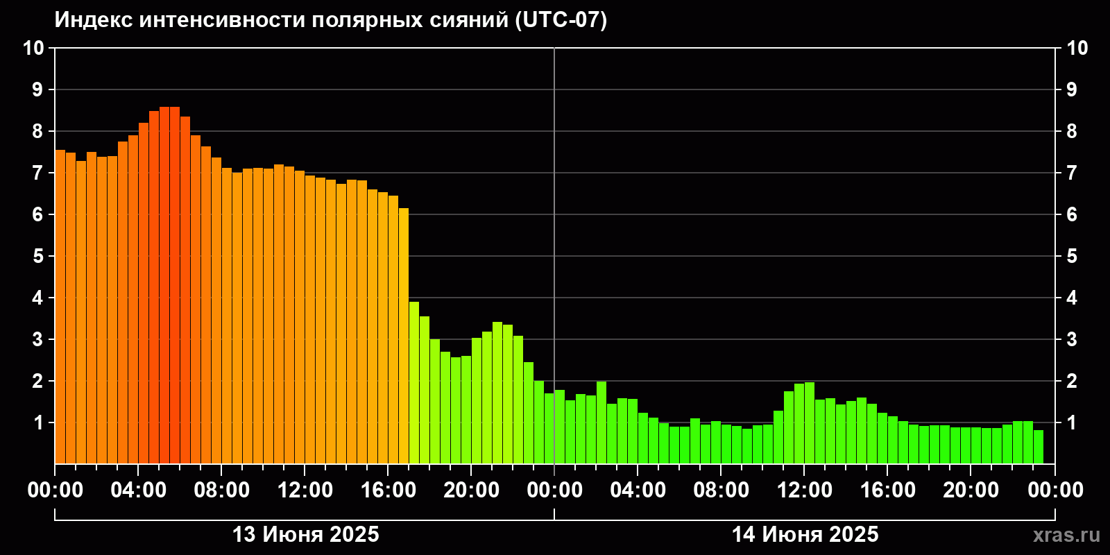 Изменения индекса интенсивности полярных сияний с 2025-06-13 по 2025-06-14 по местному времени