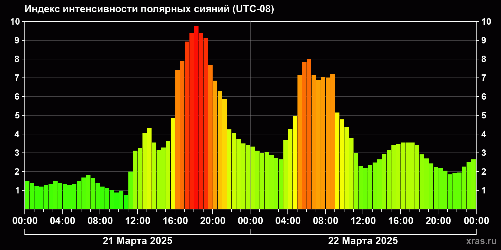Изменения индекса интенсивности полярных сияний с 2025-03-21 по 2025-03-22 по местному времени