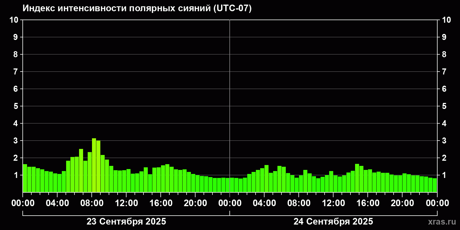 Изменения индекса интенсивности полярных сияний с 2025-09-23 по 2025-09-24 по местному времени