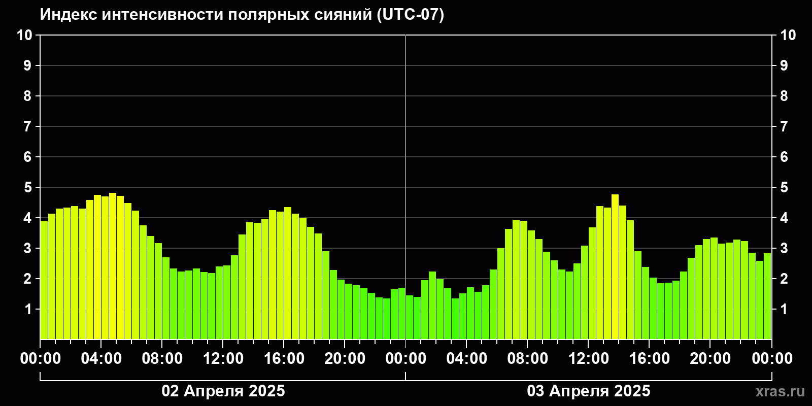 Изменения индекса интенсивности полярных сияний с 2025-04-02 по 2025-04-03 по местному времени