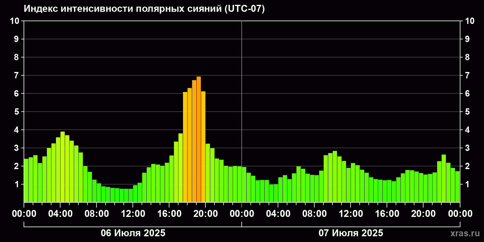 Изменения индекса интенсивности полярных сияний с 2025-07-06 по 2025-07-07 по местному времени