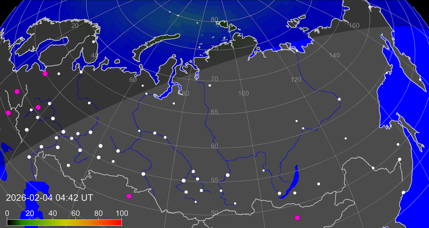 Индекс интенсивности полярных сияний и теоретически возможная широта наблюдений для ночного времени в восточном полушарии