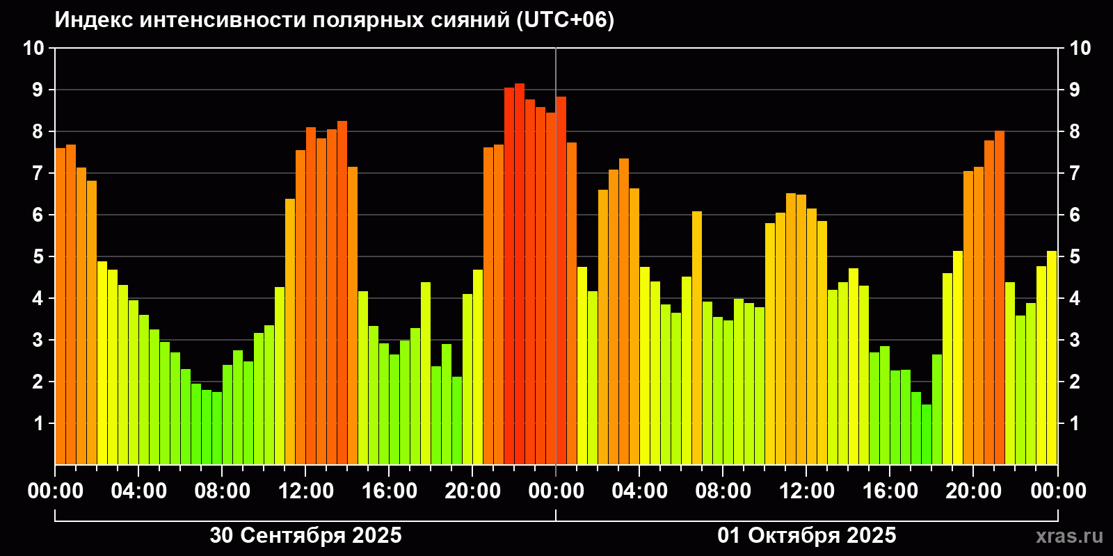 Изменения индекса интенсивности полярных сияний с 2025-09-30 по 2025-10-01 по местному времени