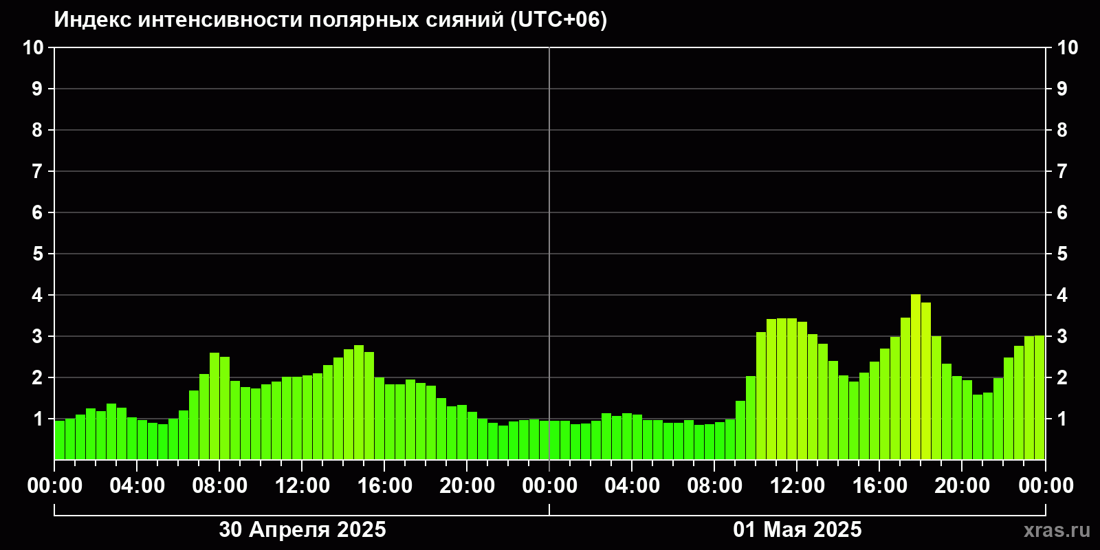 Изменения индекса интенсивности полярных сияний с 2025-04-30 по 2025-05-01 по местному времени
