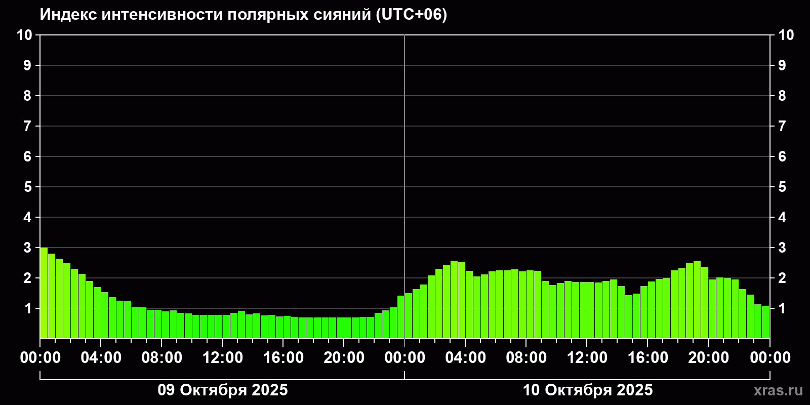 Изменения индекса интенсивности полярных сияний с 2025-10-09 по 2025-10-10 по местному времени