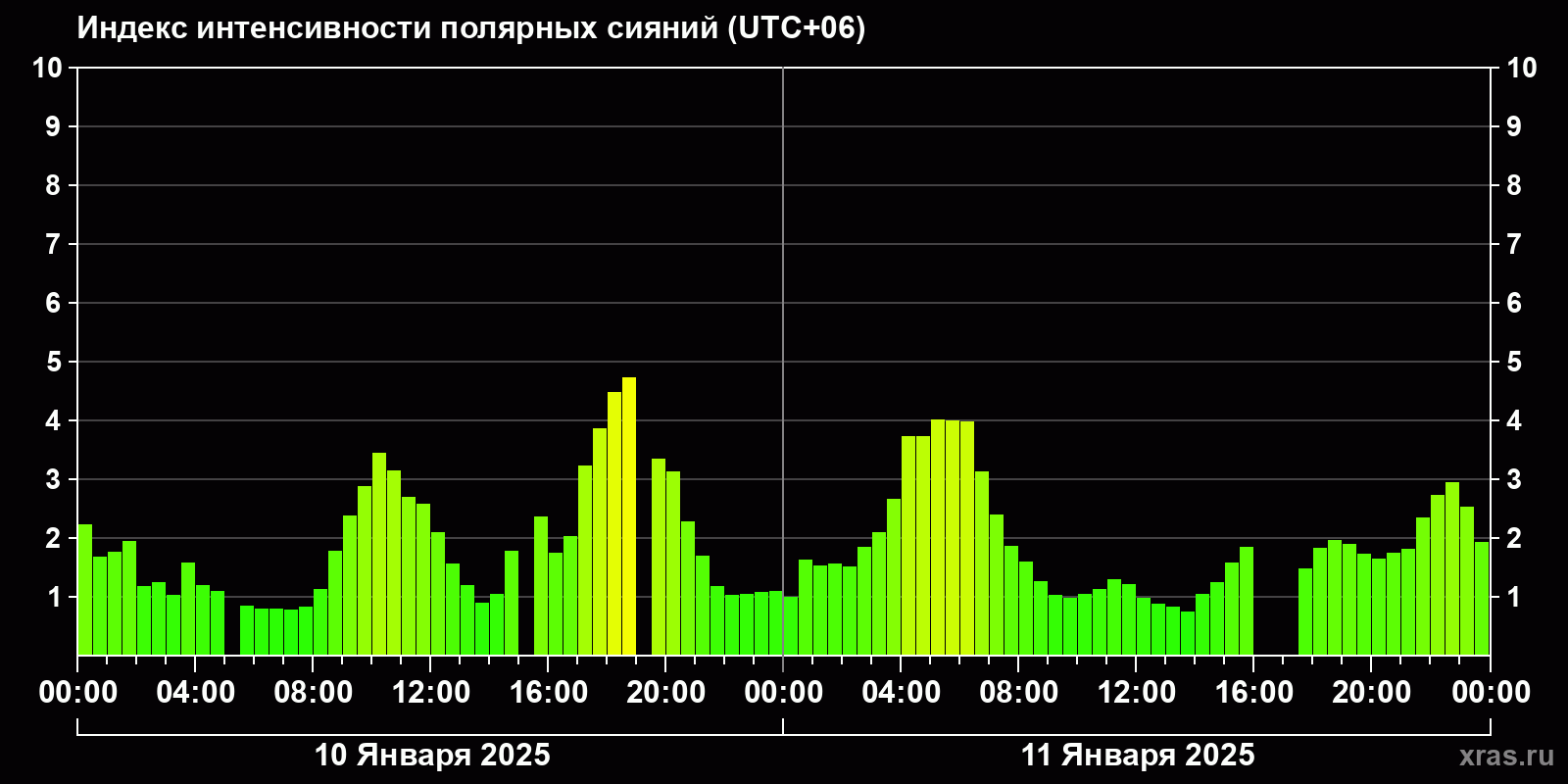Изменения индекса интенсивности полярных сияний с 2025-01-10 по 2025-01-11 по местному времени
