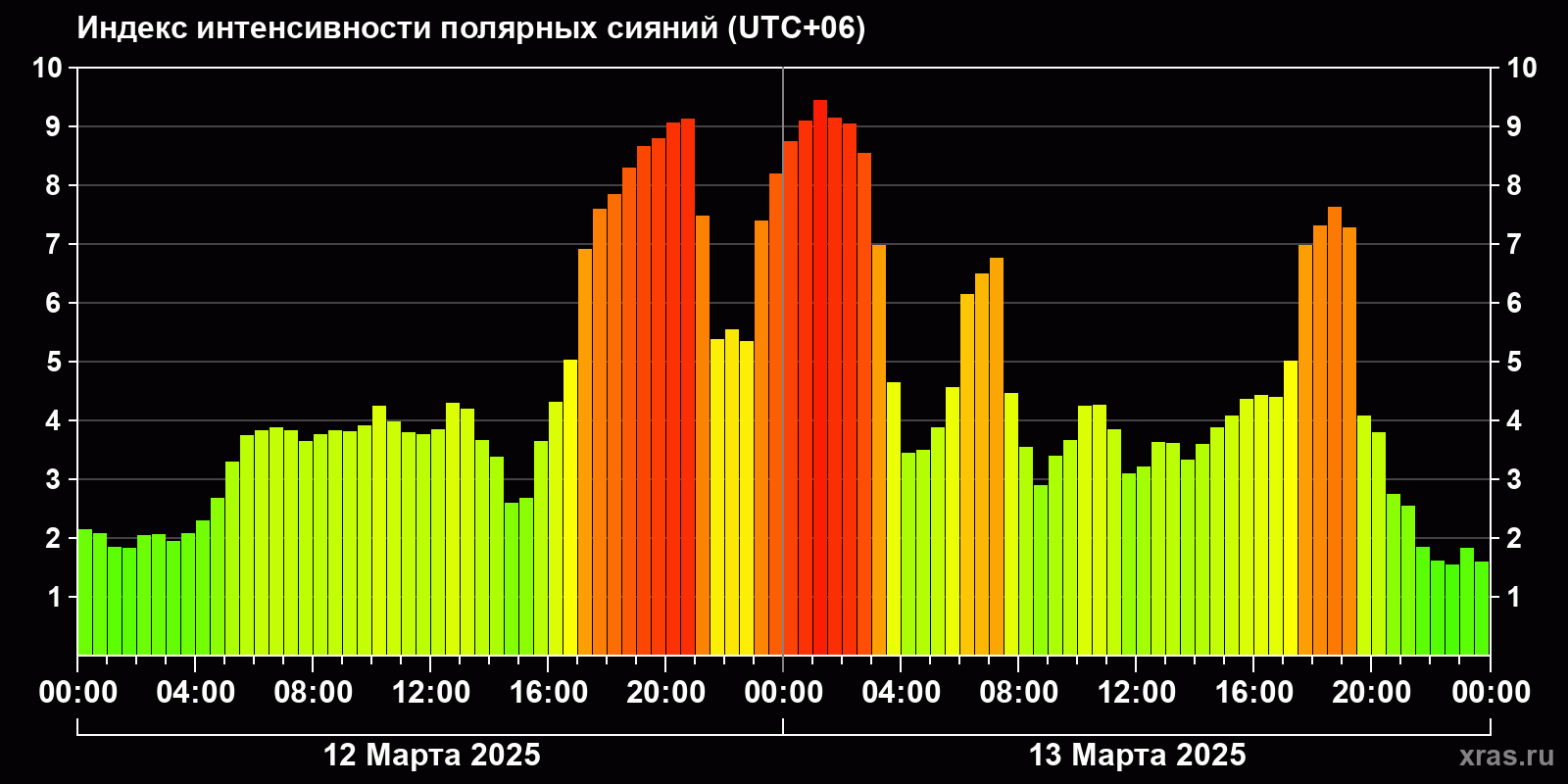 Изменения индекса интенсивности полярных сияний с 2025-03-12 по 2025-03-13 по местному времени