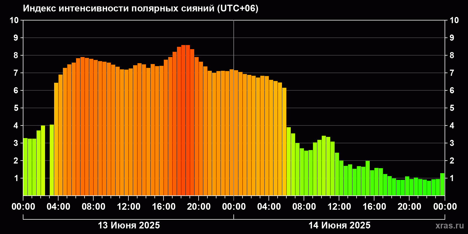 Изменения индекса интенсивности полярных сияний с 2025-06-13 по 2025-06-14 по местному времени