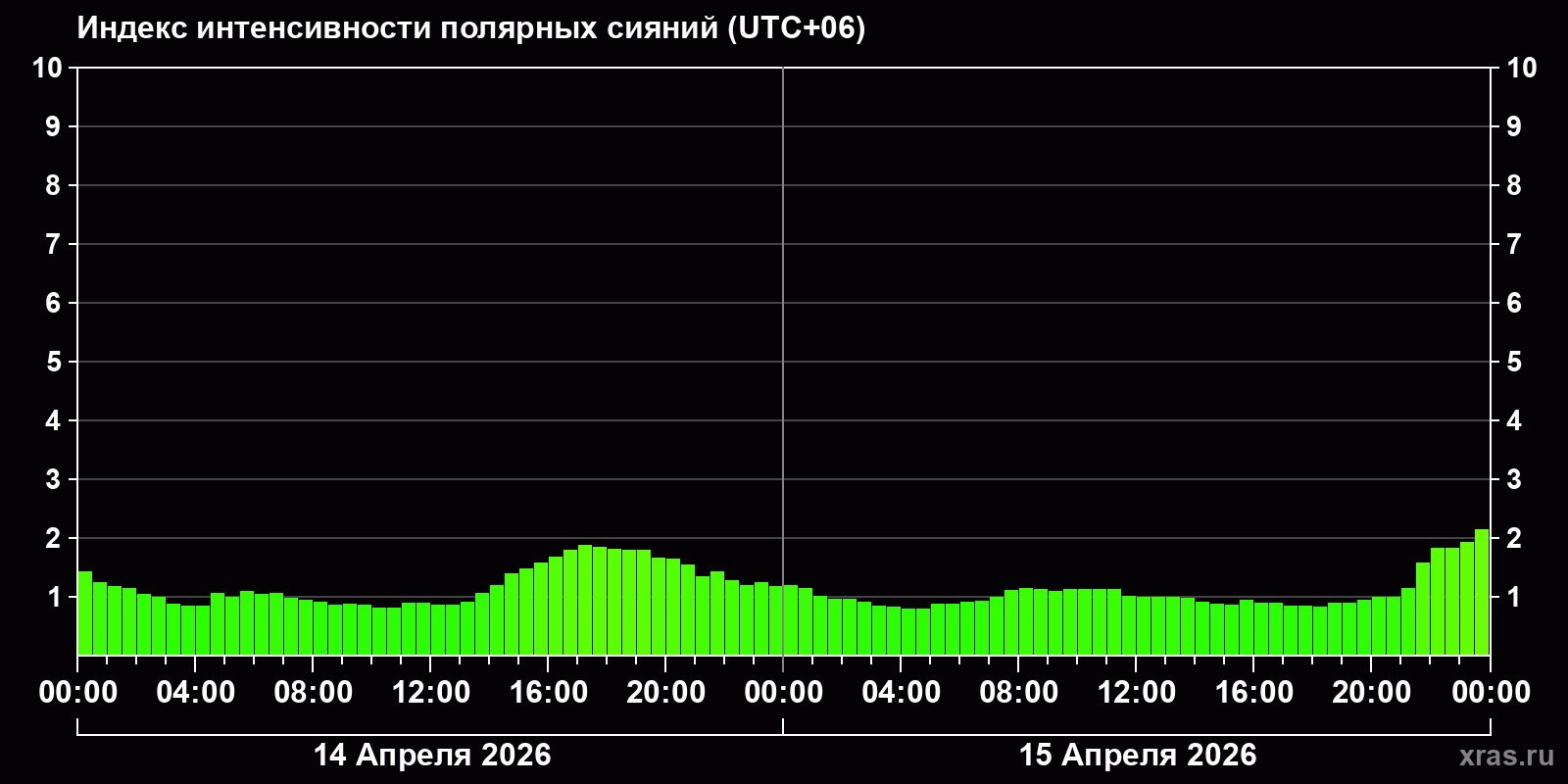 Изменения индекса интенсивности полярных сияний с 2026-04-14 по 2026-04-15 по местному времени
