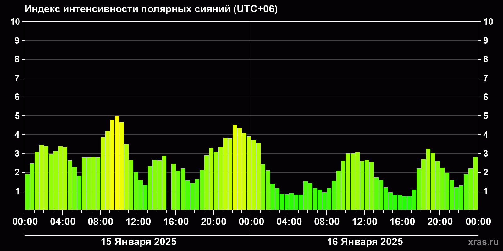 Изменения индекса интенсивности полярных сияний с 2025-01-15 по 2025-01-16 по местному времени