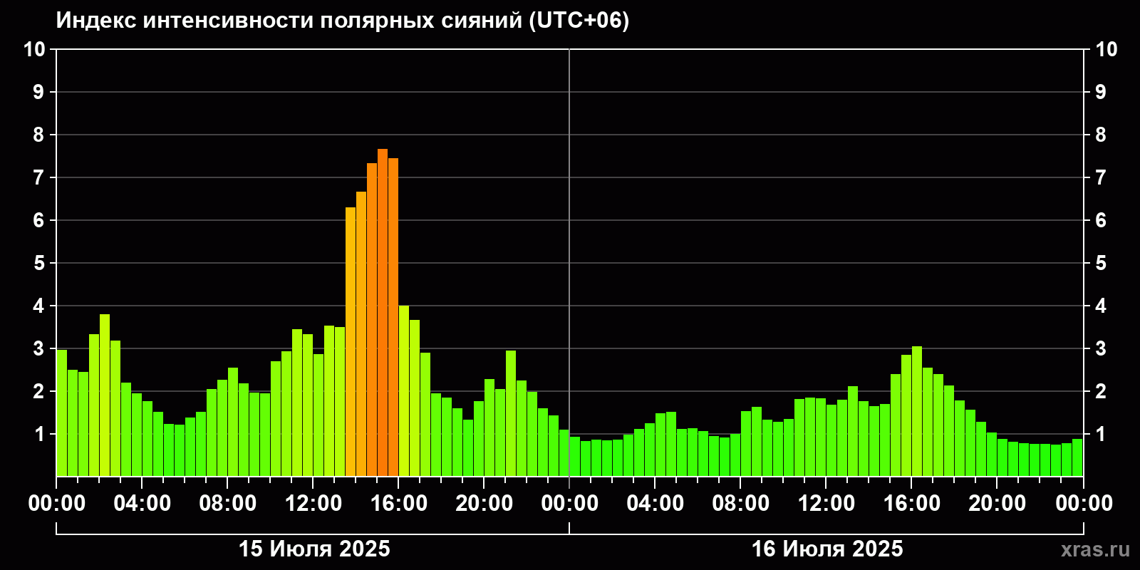 Изменения индекса интенсивности полярных сияний с 2025-07-15 по 2025-07-16 по местному времени