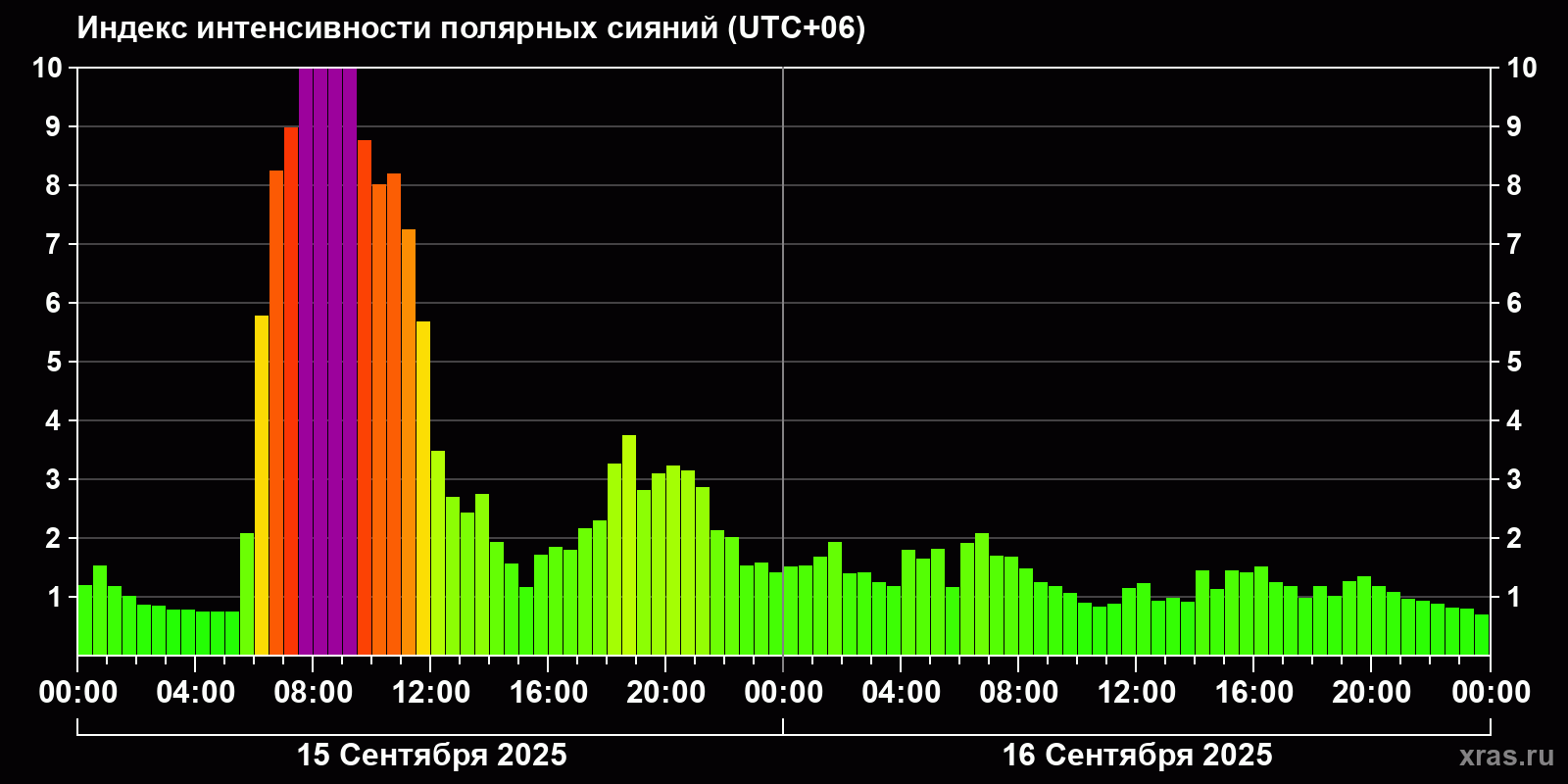Изменения индекса интенсивности полярных сияний с 2025-09-15 по 2025-09-16 по местному времени