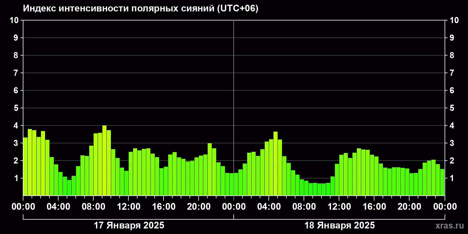 Изменения индекса интенсивности полярных сияний с 2025-01-17 по 2025-01-18 по местному времени