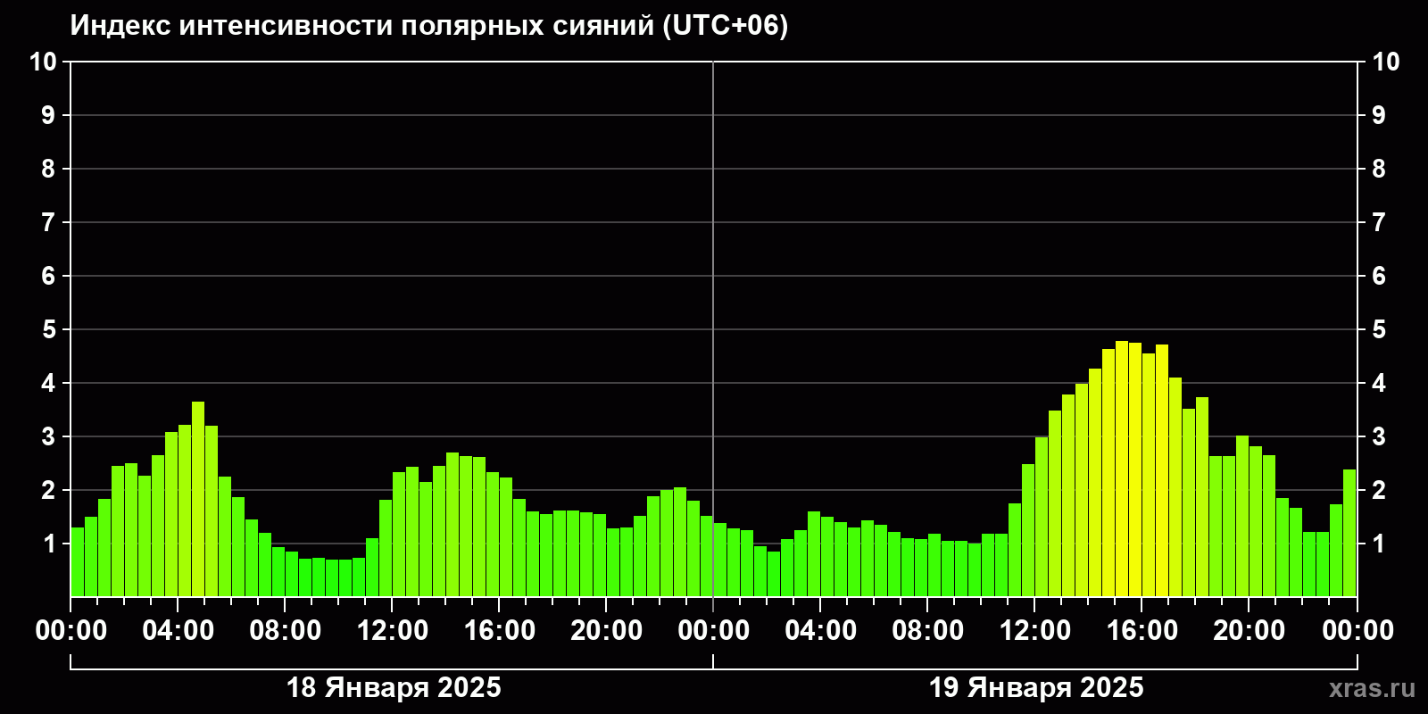 Изменения индекса интенсивности полярных сияний с 2025-01-18 по 2025-01-19 по местному времени