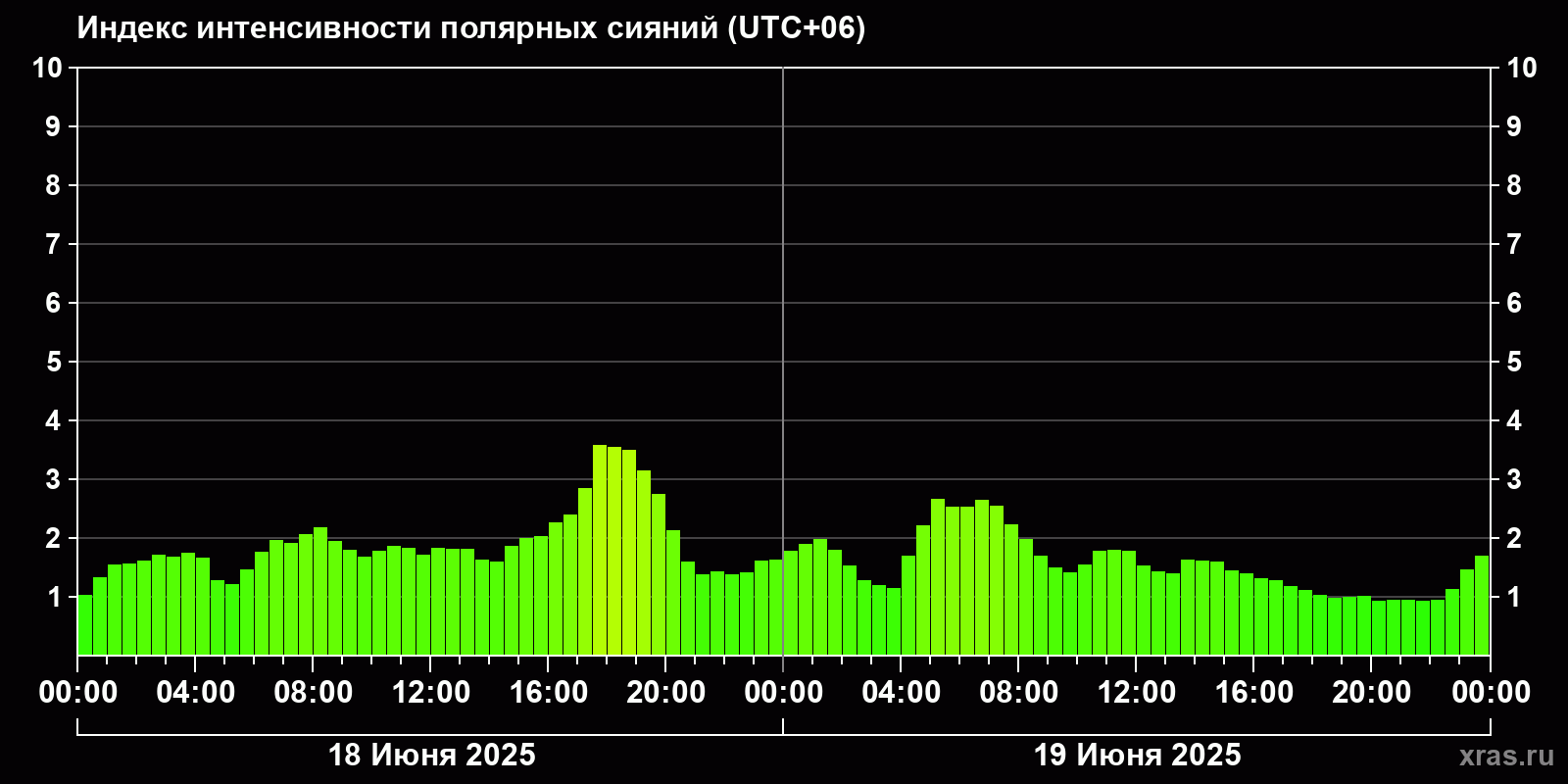 Изменения индекса интенсивности полярных сияний с 2025-06-18 по 2025-06-19 по местному времени