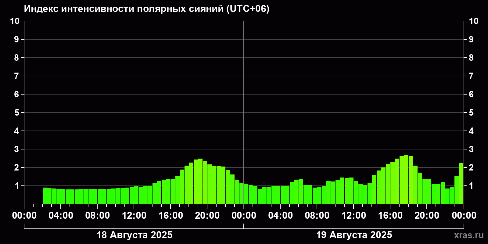 Изменения индекса интенсивности полярных сияний с 2025-08-18 по 2025-08-19 по местному времени