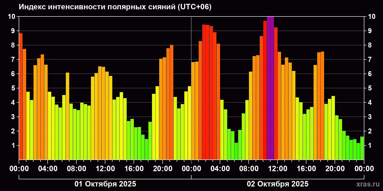 Изменения индекса интенсивности полярных сияний с 2025-10-01 по 2025-10-02 по местному времени