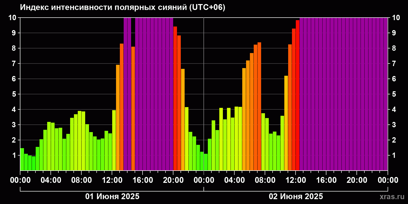 Изменения индекса интенсивности полярных сияний с 2025-06-01 по 2025-06-02 по местному времени