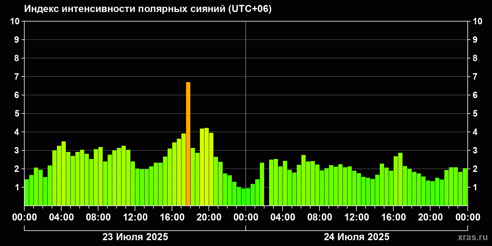 Изменения индекса интенсивности полярных сияний с 2025-07-23 по 2025-07-24 по местному времени