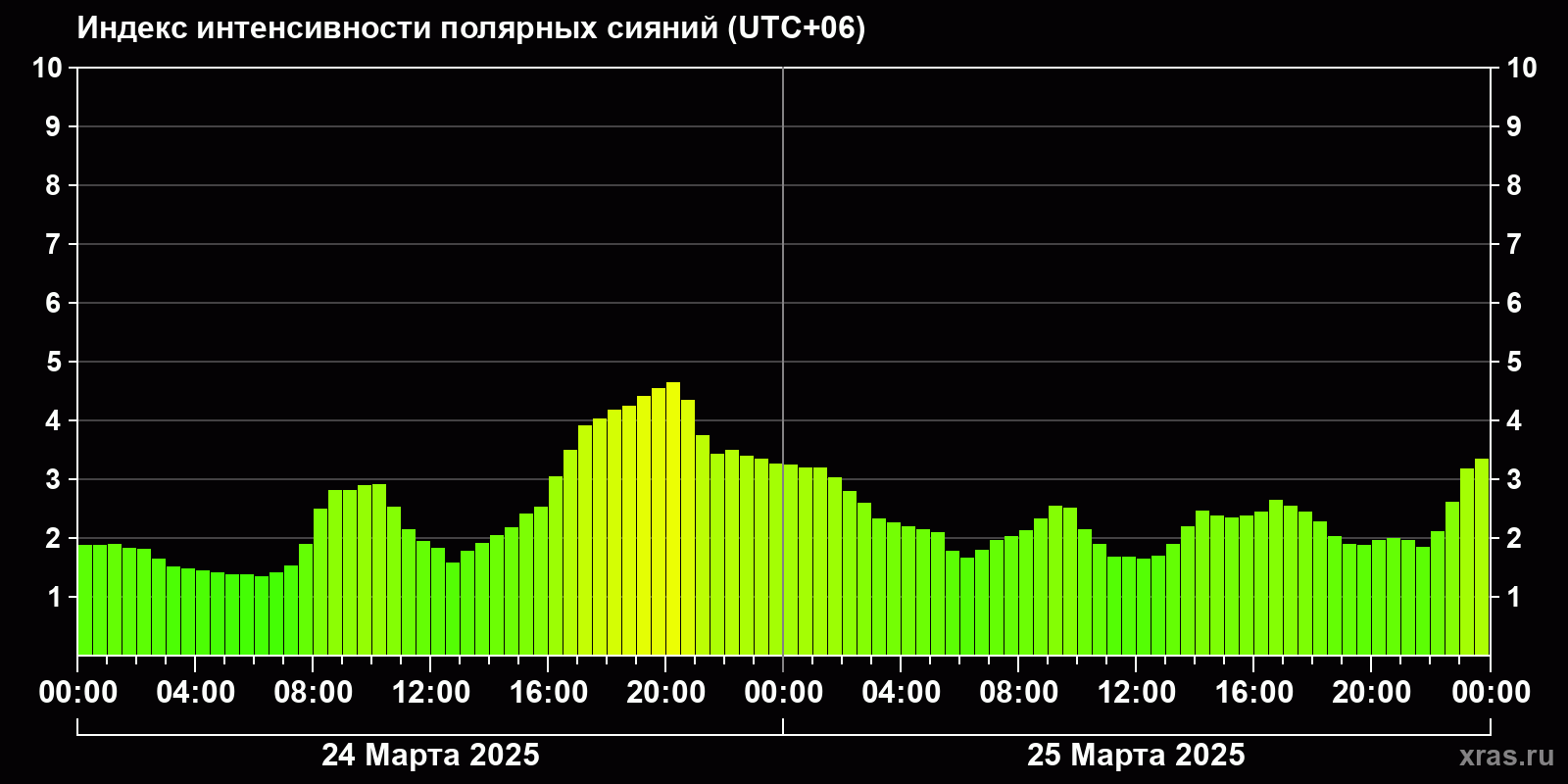 Изменения индекса интенсивности полярных сияний с 2025-03-24 по 2025-03-25 по местному времени