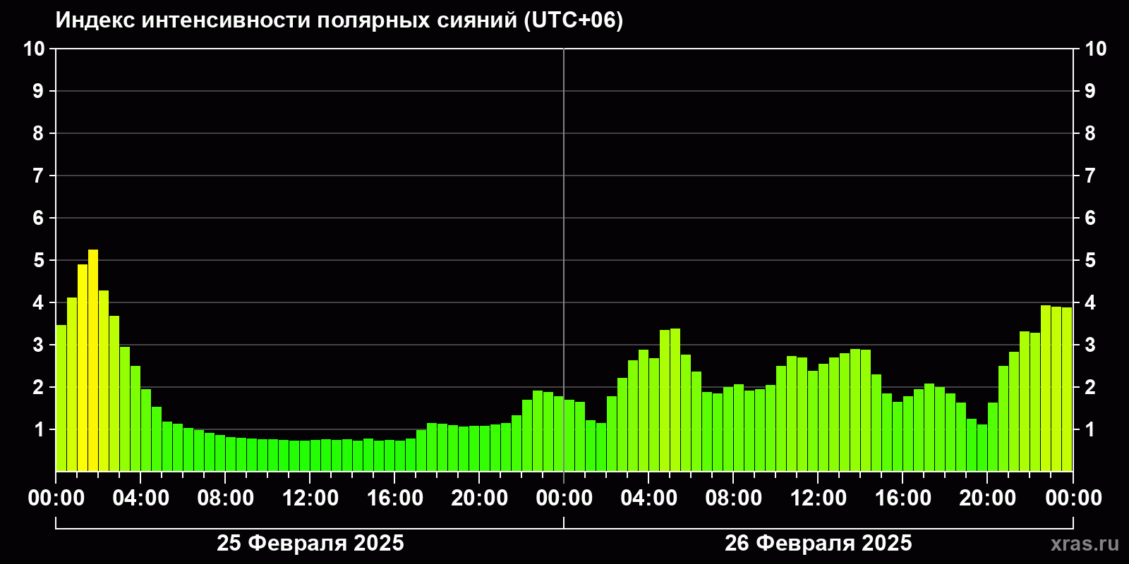 Изменения индекса интенсивности полярных сияний с 2025-02-25 по 2025-02-26 по местному времени