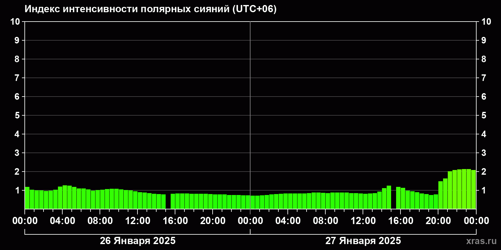 Изменения индекса интенсивности полярных сияний с 2025-01-26 по 2025-01-27 по местному времени