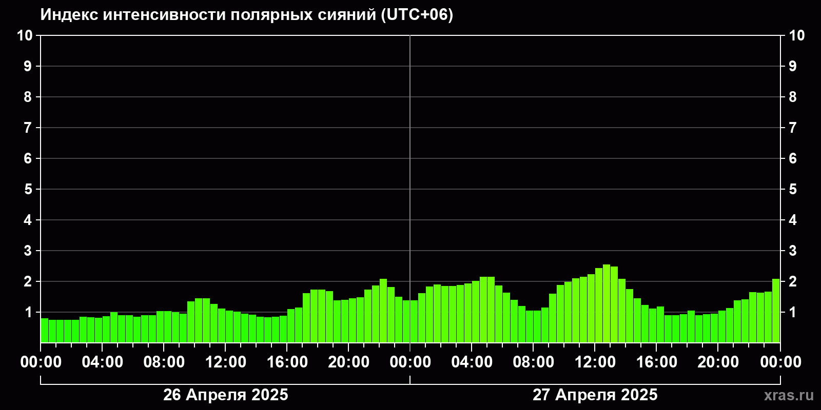 Изменения индекса интенсивности полярных сияний с 2025-04-26 по 2025-04-27 по местному времени