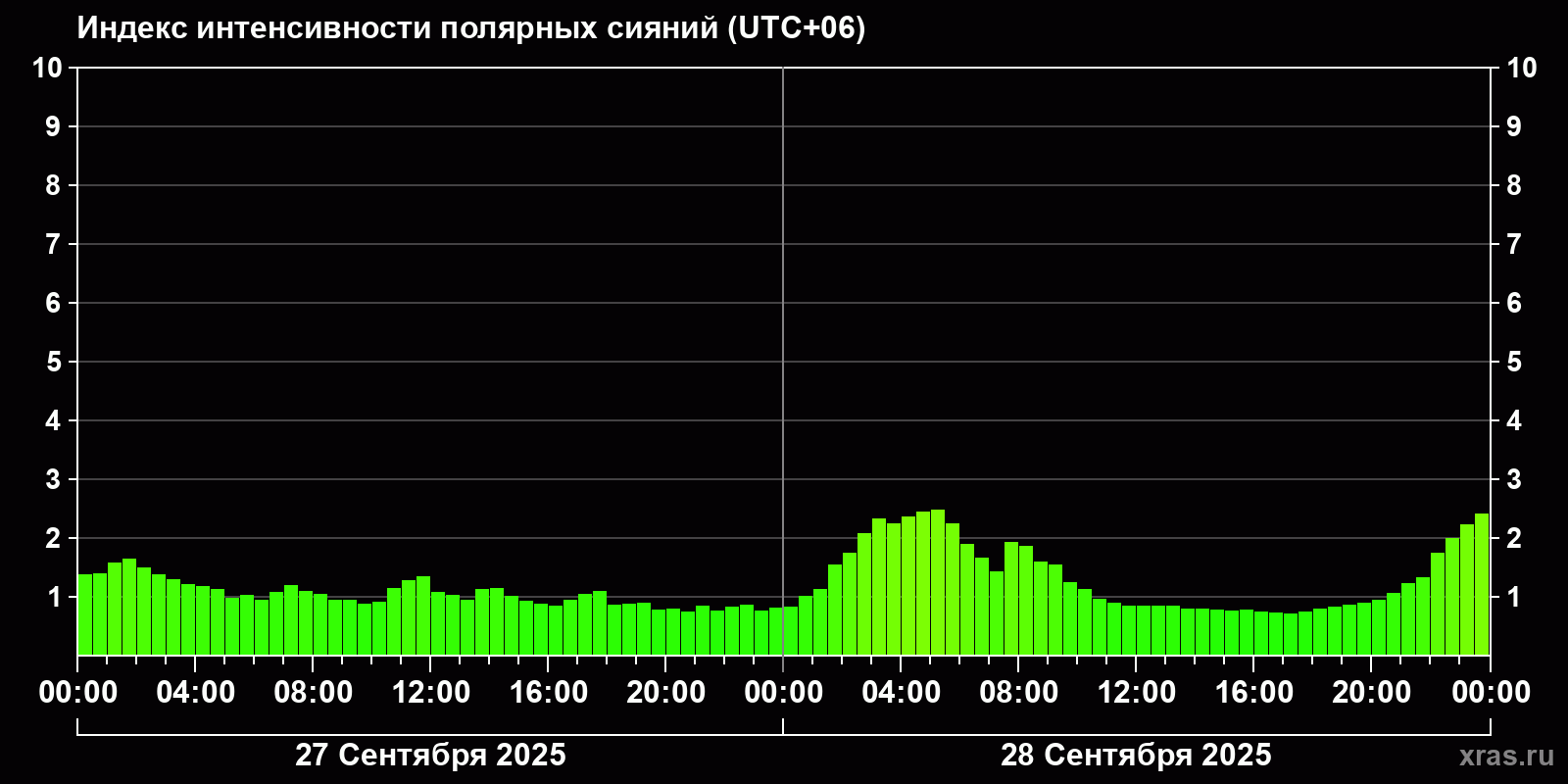 Изменения индекса интенсивности полярных сияний с 2025-09-27 по 2025-09-28 по местному времени