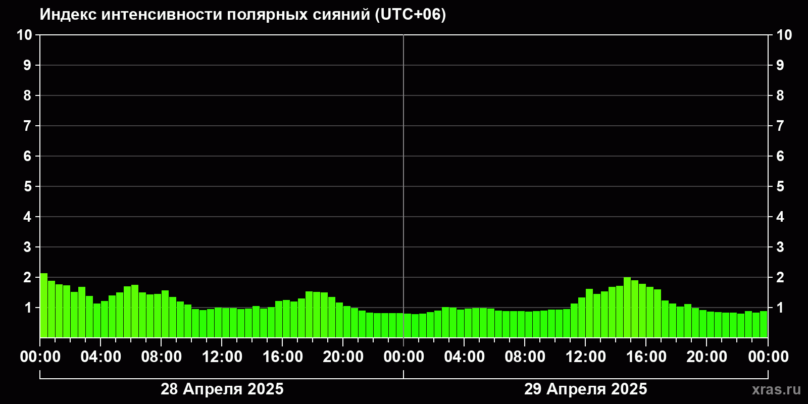 Изменения индекса интенсивности полярных сияний с 2025-04-28 по 2025-04-29 по местному времени
