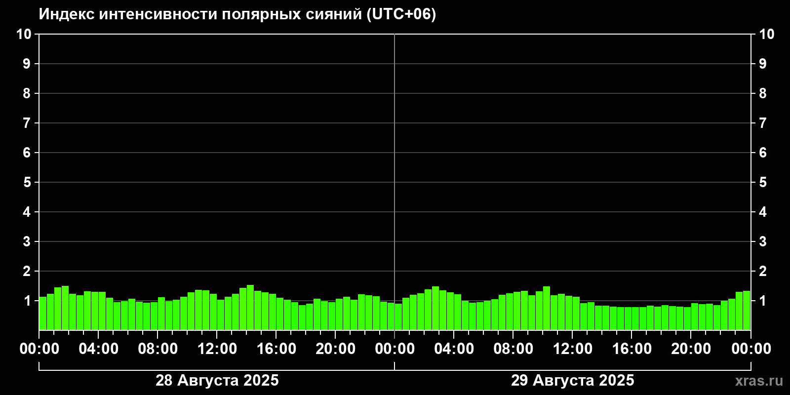 Изменения индекса интенсивности полярных сияний с 2025-08-28 по 2025-08-29 по местному времени