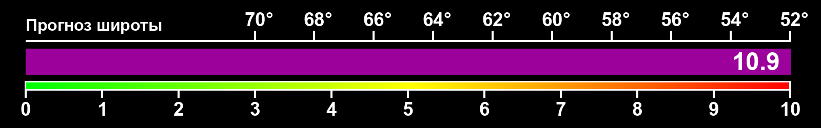 Индекс интенсивности полярных сияний и теоретически возможная широта наблюдений для ночного времени в восточном полушарии по состоянию на 2026-04-03 23:45 (конец дня) по местному времени