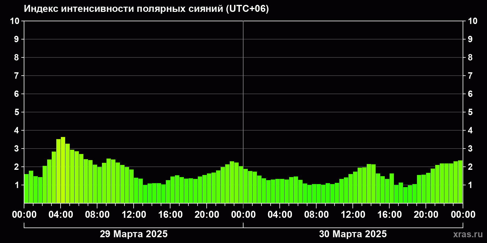 Изменения индекса интенсивности полярных сияний с 2025-03-29 по 2025-03-30 по местному времени